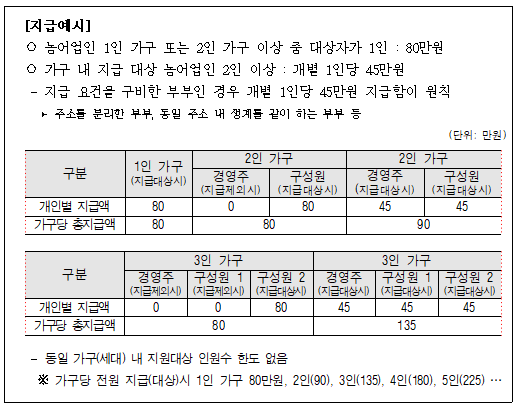 1. 지급금액 : 가구당 대상자가 1인일 경우 연 80만원, 2인일 경우 1인당 연 45만원 지급