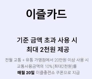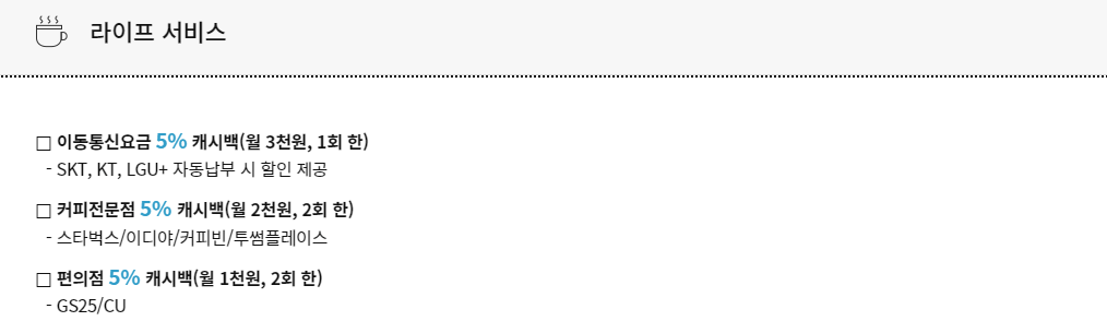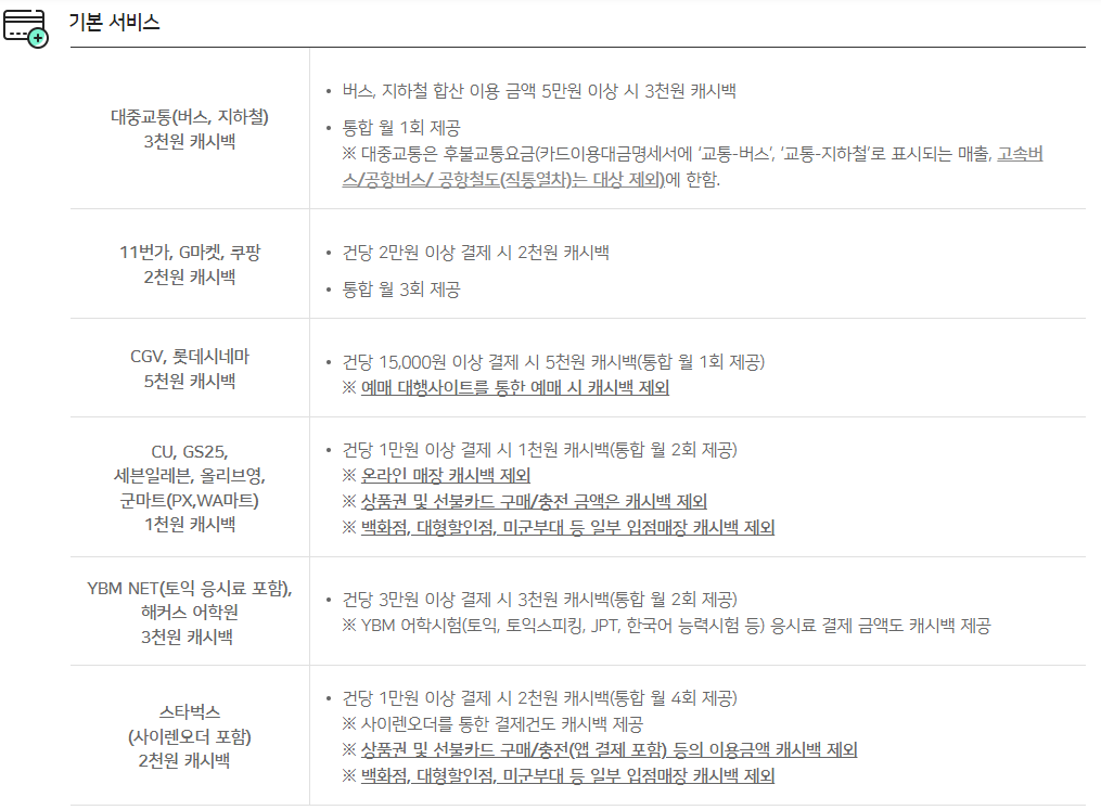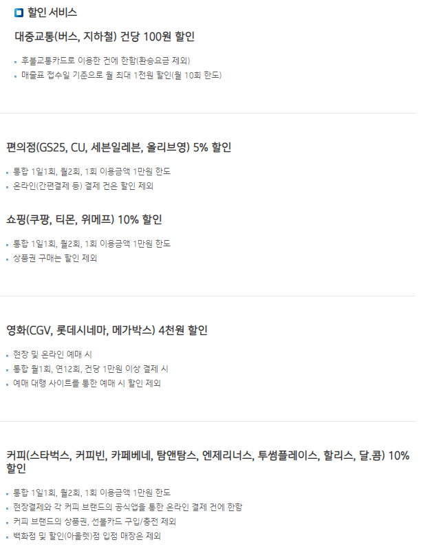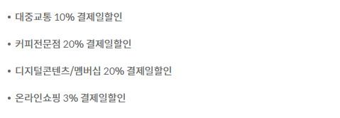 - 전월실적 50만원 이상 1만원(커피 5천원), 100만원 이상 대중교통할인 2만원 한도