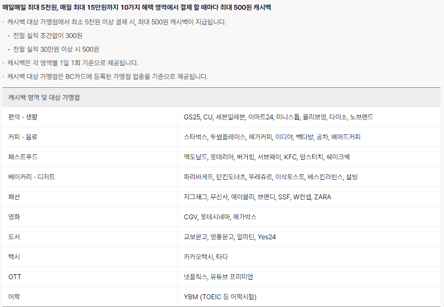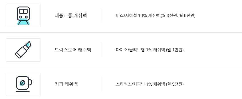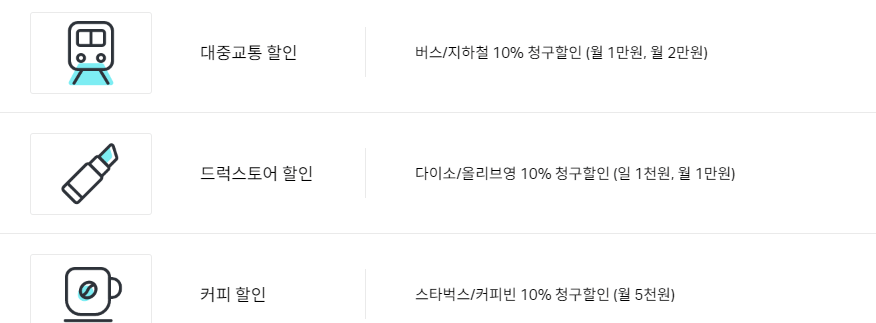 대중교통 10% 다이소,올리브영 1% 스타벅스,커피빈 1% |