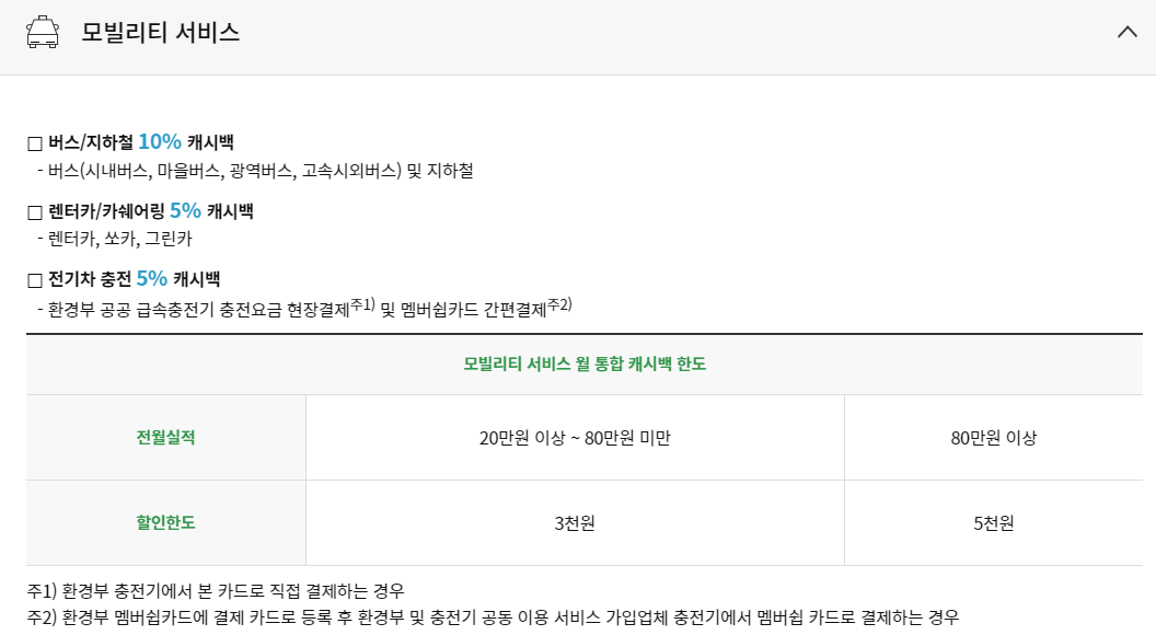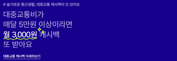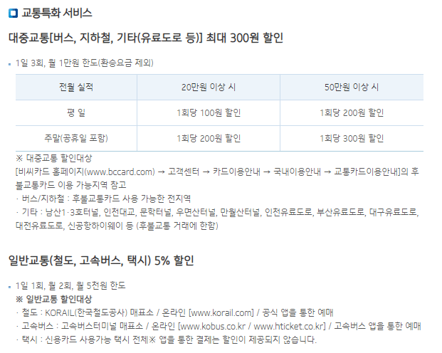 - 전월실적 40만원 이상 대중교통 5천원/그외 4천원, 80만원 이상 대중교통 1만원/그외 8천원
