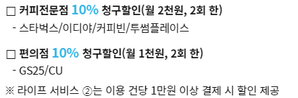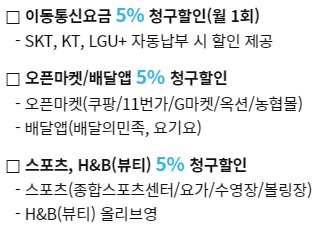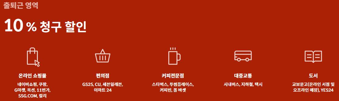 대중교통,렌터카등10% 통신,오픈마켓,배달,스포츠,뷰티 5% 커피,편의점 10% |