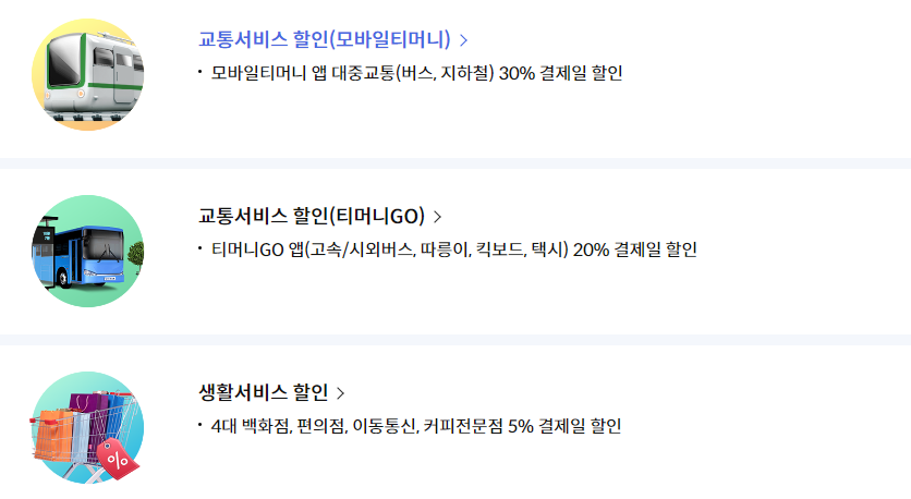 대중교통100~200원/회 일반교통 5% 주유 리터당 40원 아웃백, 빕스 10% 등 |