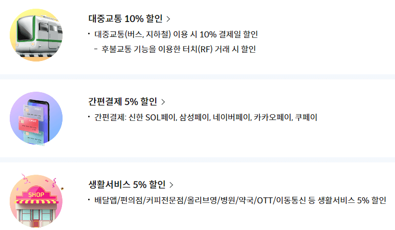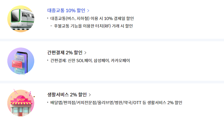 | 신한 👆 | 20 | 2천원 | 대중교통 10% 간편결제 2% 생활서비스 2% |