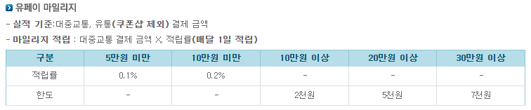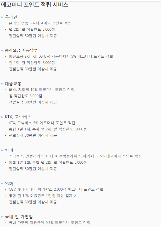 30 | 월 3천점 | 온라인, 통신, KTX, 고속버스, 커피 5% 대중교통 10% |