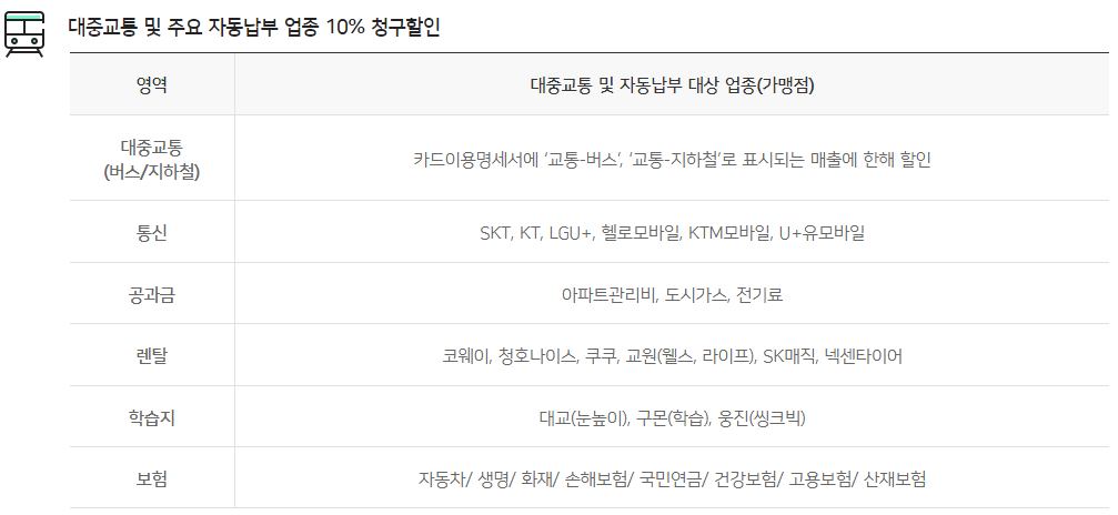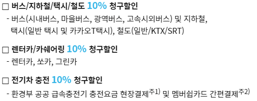 대중교통 10% 렌터카등,통신,커피,편의점 5% |