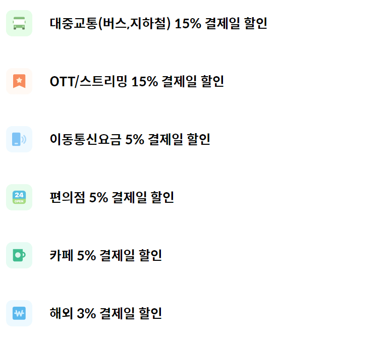 30 | 1만원 | 대중교통,OTT 15% 통신,편의점,카페 5% 해외 3% 할인 |