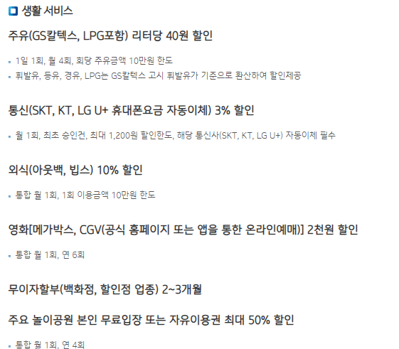 | 카드사 | 최소실적(만원) | 할인한도 | 제공서비스 |