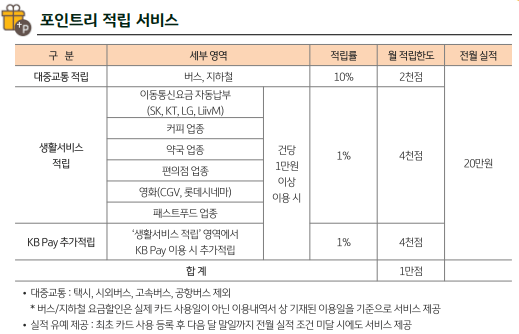 | 국민 👆 | 20 | 대중교통 2천 통신,커피,약국등 4천 KB페이추가 4천 |